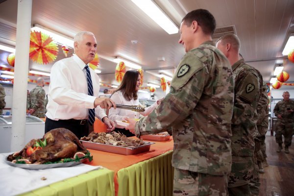 Pence de Twitter hesabı üzerinden askeri üste eşi Karen Pence ile çektirdiği fotoğrafları paylaşarak, Şükran Günü için Irak’ta olmaktan gurur duyduğunu ifade etti.