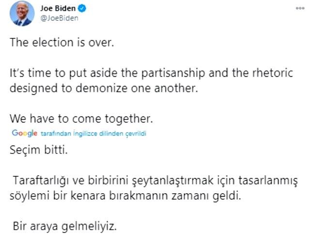 Biden sosyal medya hesabı üzerinden yaptığı paylaşımda, “Seçim bitti. Taraftarlığı ve birbirini şeytanlaştırmak için tasarlanmış söylemleri bir kenara bırakmanın zamanı geldi. Bir araya gelmeliyiz” dedi.