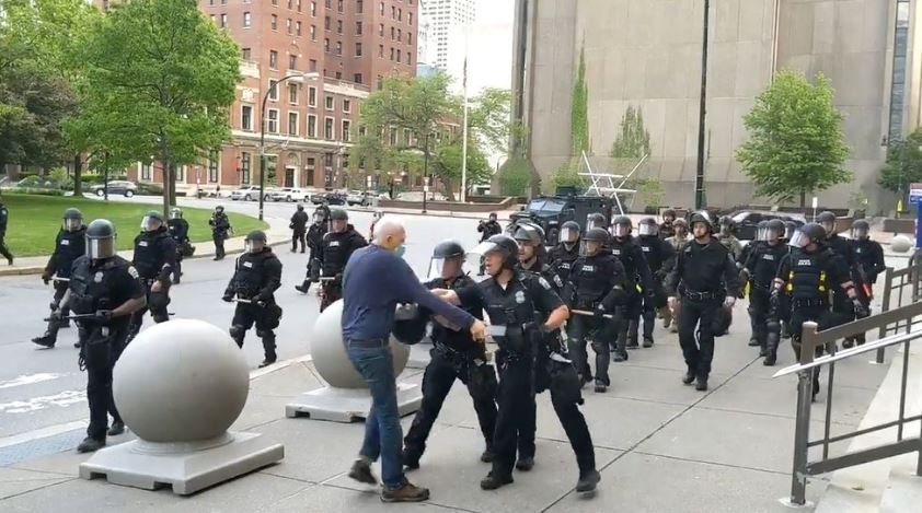 Buffalo’nun merkezindeki belediye binası önünde çekilen görüntülerde 75 yaşındaki bir adam bir anda polisin arasında kalıyor. Bu sırada bir polis yaşlı adamı çok sert bir biçimde yere ittiriyor.