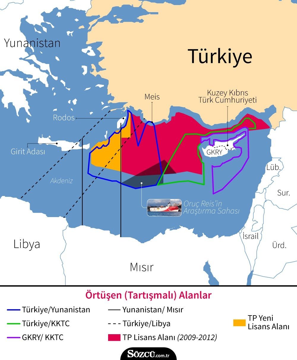 Bunun üzerine Türkiye, Libya’yla deniz yetki alanı mutabakatı yaptı ve bu anlaşmaya Atina’nın yanı sıra Fransa dahil, İtalya, İsrail, Mısır, Lübnan dahil diğer Akdeniz ülkeleri de tepki gösterdi. Türkiye Petrolleri Anonim Ortaklığı’nın (TP) ruhsat alanları o dönemde gerilim yaratmıştı. Hatta Fransa Cumhurbaşkanı Macron, Ocak 2020 sonunda Yunanistan Başbakanı Miçotakis ile görüşmesinin ardından bölgeye Fransız savaş gemilerini göndermeyi teklif etmişti.