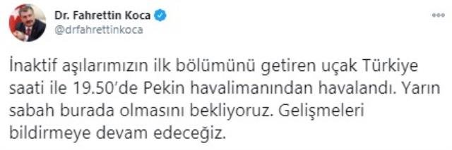 Sağlık Bakanı Fahrettin Koca, Twitter hesabından yaptığı açıklamada, Çin aşılarının ilk bölümünü getiren uçağın Türkiye saati ile 19.50’de Pekin Havalimanı’ndan havalandığı belirtti.