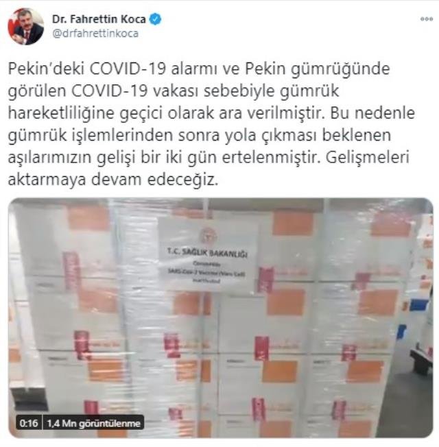 Öte yandan Bakan Koca, geçtiğimiz günlerde, Pekin’deki Kovid-19 alarmı ve Pekin gümrüğünde görülen Kovid-19 vakası sebebiyle gümrük hareketliliğine geçici olarak ara verildiğini belirterek, “Bu nedenle gümrük işlemlerinden sonra yola çıkması beklenen aşılarımızın gelişi bir iki gün ertelenmiştir. Gelişmeleri aktarmaya devam edeceğiz” ifadelerini kullanmıştı.