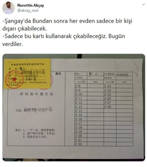 Akçay’ın son paylaşımı, Corona virüsüyle ilgili gelinen son durumun boyutunu gözler önüne serdi. Akçay, Şangay’da Corona virüsüne karşı kart dağıtıldığını ve bu kartla artık her evden sadece bir kişinin dışarı çıkabileceğini belirtti.
