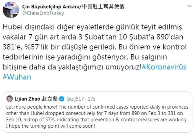 “Hubei dışındaki diğer eyaletlerde günlük teyit edilmiş vakalar 7 gün art arda 3 Şubat’tan 10 Şubat’a 890’dan 381’e, %57’lik bir düşüşle geriledi. Bu önlem ve kontrol tedbirlerinin işe yaradığını gösteriyor. Bu salgının bitişine daha da yaklaştığımızı umuyoruz!”