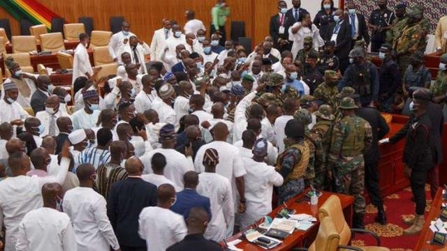 Gana Parlamentosu’nda Ulusal Demokratik Kongre ve Yeni Vatansever Parti arasında yaşanan Meclis Başkanlığı seçimi çatışmaya döndü. İki parti milletvekilleri arasında çıkan arbedeye ordu müdahale etti.