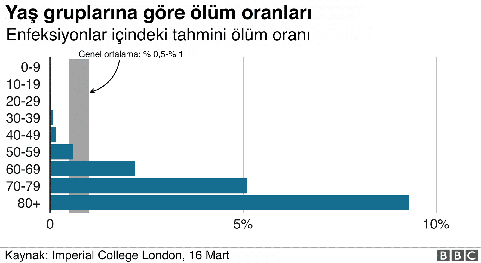 Imperial College London’ın tahminlerine göre, 80 yaşın üzerindekilerde ölüm oranı ortalamanın yaklaşık 10 kat üzerinde. 40 yaş altındakilerse daha çok daha düşük.