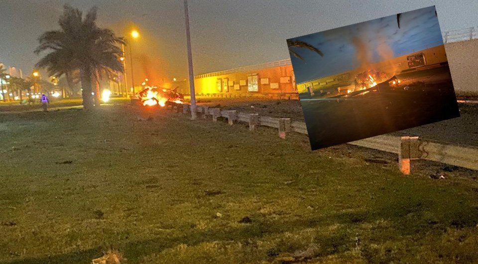 FOTO: Reuters/ Bağdat Uluslararası Havalimanı yakınlarına yönelik füze saldırısının ardından yolda yanan bir enkaz görülüyor.