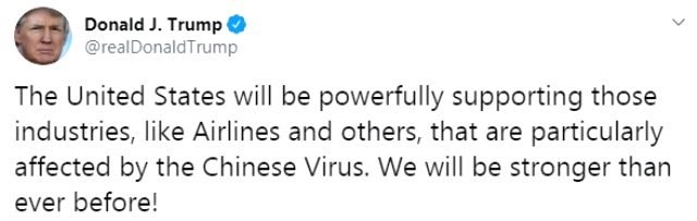 Trump, söz konusu tweetinde “Amerika Birleşik Devletleri, özellikle Çin Virüsü’nden etkilenen havayolları ve diğer endüstrileri güçlü bir şekilde destekleyecektir. Her zamankinden daha güçlü olacağız!” ifadelerini kullandı.