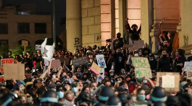 Önceki gün kameralar karşısıan İncil ile çıkarak poz veren ve büyük tepki toplayan Trump, yoğun güvenlik önlemleri altında Aziz İkinci Jean Paul Anıtı’na gitti. Fakat çok sayıda aracın olduğu kortejin geçtiği yollarda Trump çok sert bir protesto gösterisiyle karşılaştı.