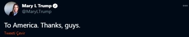 Öte yandan Mary Trump, amcasının başkanlık seçimleriyle ilgili hile iddialarına çok sert çıktı. Yeğen Trump, “Biri onu durdursun. Çaresiz durumda, debelenip duruyor ve bu işin sonlanmasını aciz bir şekilde izlemek dışında yasal olarak yapabileceği hiçbir şey yok” dedi.