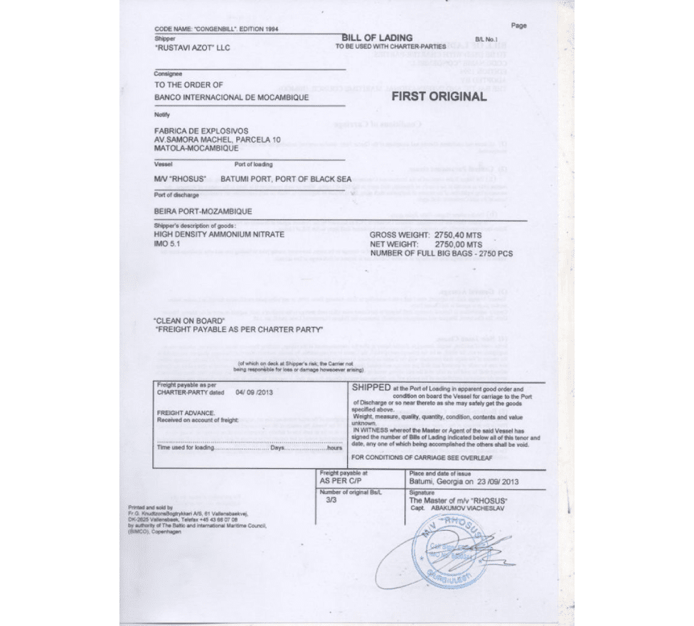 Konşimentoya göre, amonyum nitratı tedarik eden Rustavi Azot LLC şirketiydi ve alıcı da, ticari patlayıcılar alanında uzman küçük bir Mozambikli şirket adına, Uluslararası Mozambik Bankası’ydı.