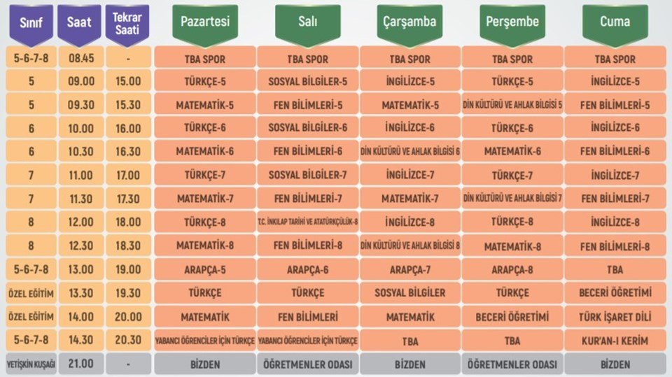 21-25 Eylül Haftası EBA TV ortaokul ders programı