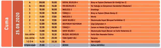 25 EYLÜL İLKOKUL CANLI DERS SAATLERİ