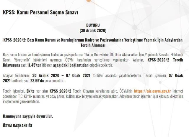 KPSS-2020/2 Kamu Personeli yerleştirme aday tercih işlemleri 30 Aralık 2020-7 Ocak 2021 arasında yapılacak. “Kamu Görevlerine İlk Defa Atanacaklar İçin Yapılacak Sınavlar Hakkında Genel Yönetmelik” hükümleri çerçevesinde Bakanlık koordinasyonunda tüm işlemler yürütülecek.
