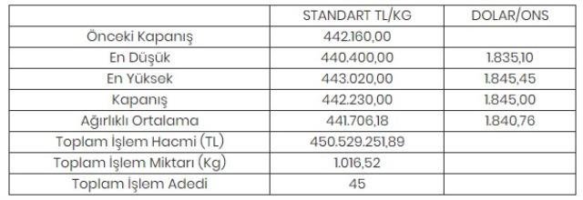 Borsa İstanbul Kıymetli Madenler ve Kıymetli Taşlar Piyasası’nda (KMKTP), altında gerçekleşen toplam işlem hacmi 450 milyon 529 bin 251,89 lira, işlem miktarı ise 1.016,52 kilogram oldu. Tüm metallerdeki toplam işlem hacmi ise 458 milyon 507 bin 419,41 lira oldu.