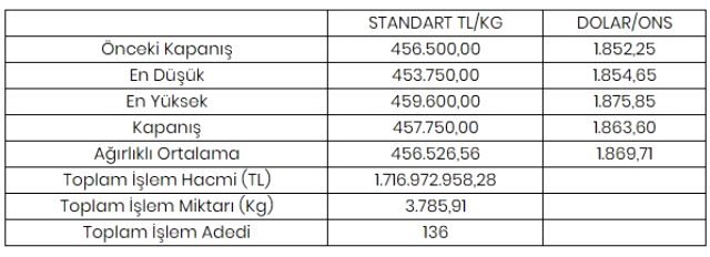 Altın piyasasında, en düşük 453 bin 750 lira, en yüksek 459 bin 600 lirayı gören standart altının kilogram fiyatı, günü önceki kapanışa göre yüzde 0,3 artışla 457 bin 750 liradan tamamladı.