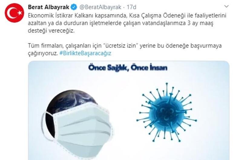 Hazine ve Maliye Bakanı Berat Albayrak, Twitter hesabından yaptığı açıklamada, “Ekonomik İstikrar Kalkanı kapsamında, Kısa Çalışma Ödeneği ile faaliyetlerini azaltan ya da durduran işletmelerde çalışan vatandaşlarımıza 3 ay maaş desteği vereceğiz. Tüm firmaları, çalışanları için ücretsiz izin yerine bu ödeneğe başvurmaya çağırıyoruz” dedi.