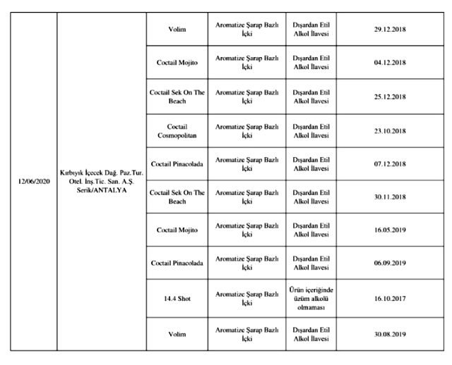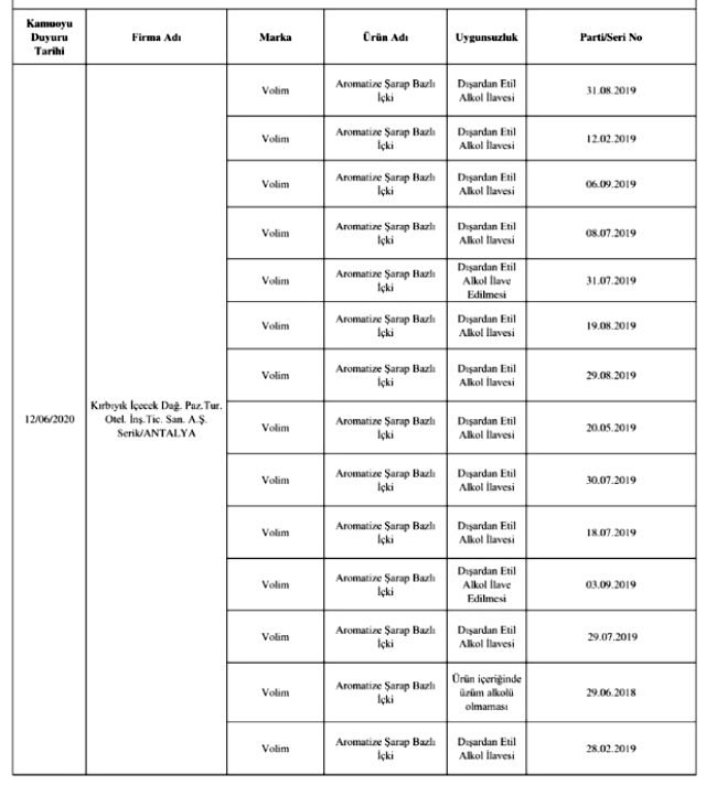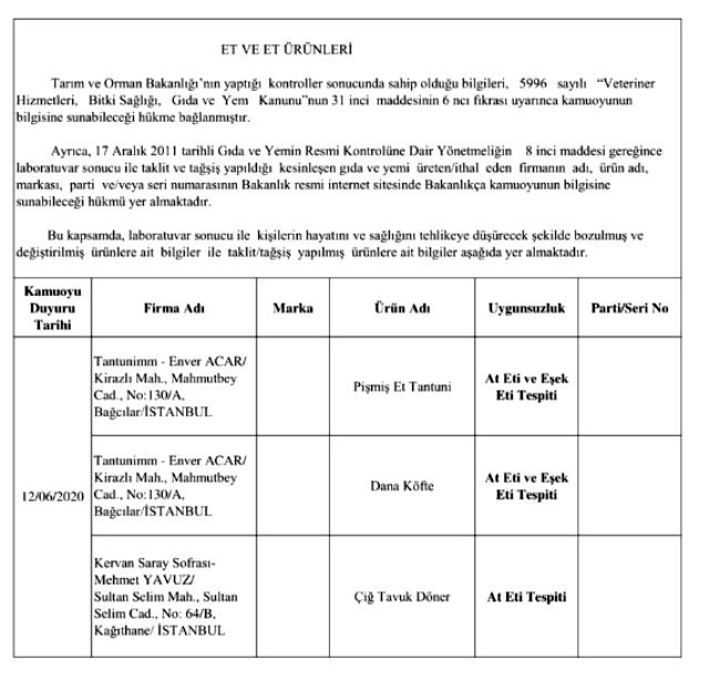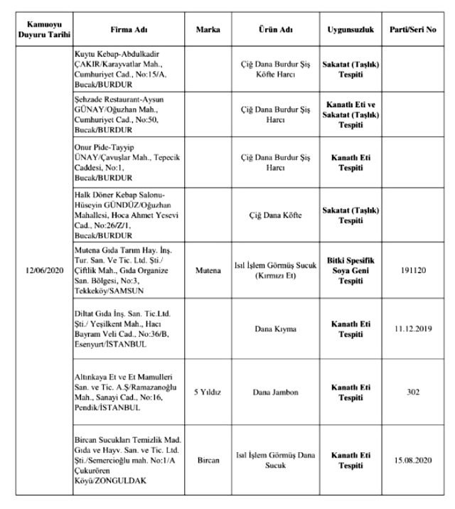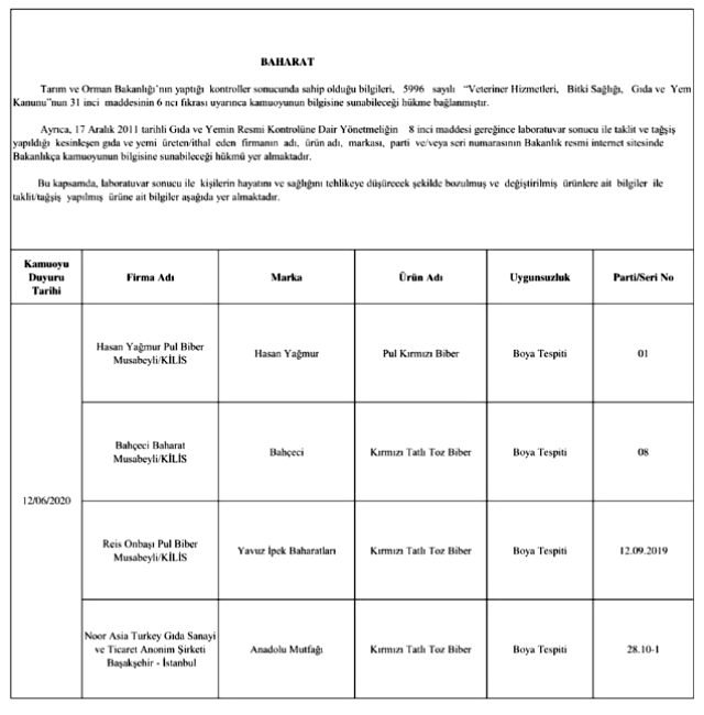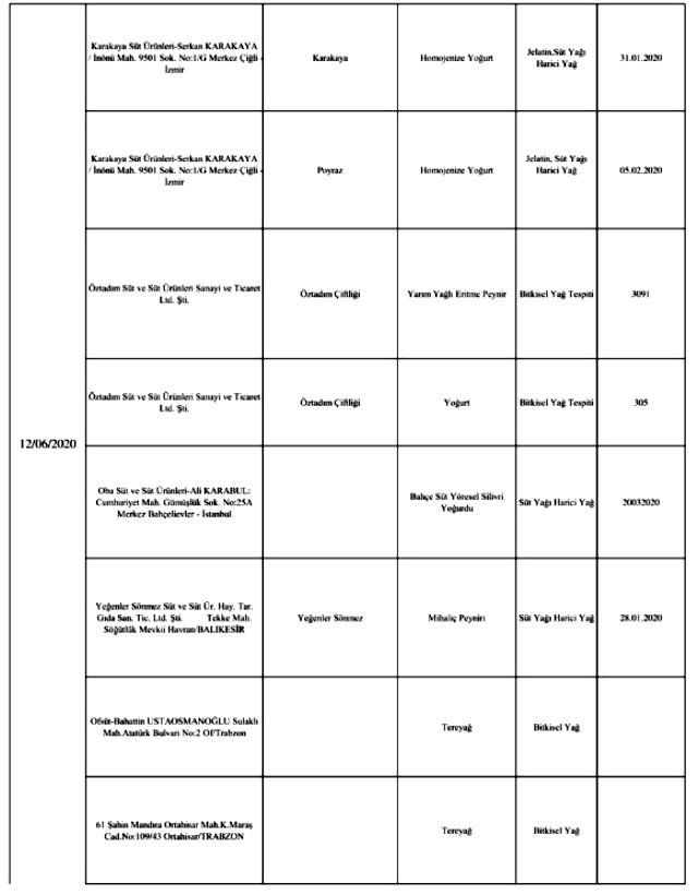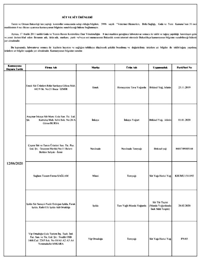 Bakanlığın yayınladığı listede laboratuvar sonucuyla taklit veya tağşiş yapıldığı kesinleşen gıdaları üreten/ithal eden; kişilerin hayatını ve sağlığını tehlikeye düşürecek şekilde bozulmuş, değiştirilmiş gıdaları üreten ve/veya satan firmanın adı, ürün adı, markası, parti ve/veya seri numarasını içeren bilgiler kamuoyunun bilgisine sunuldu.