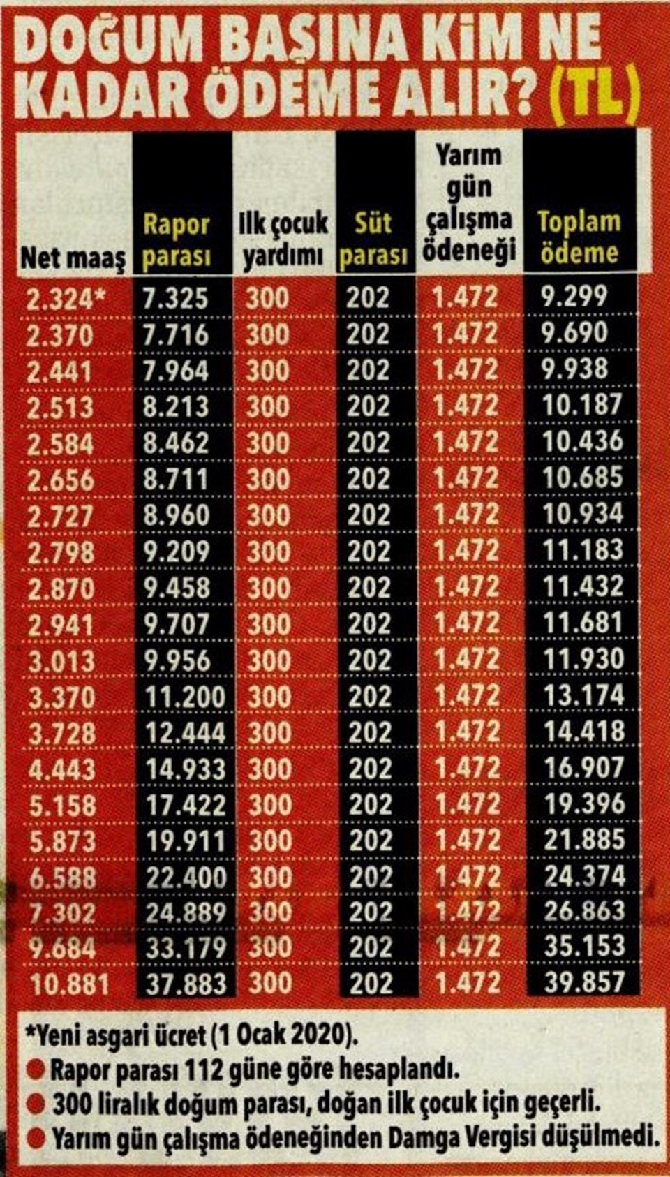 Doğum (rapor) parası, maaşa göre değişiyor ve 112 gün üzerinden hesaplanıyor. En düşük tutar 1 Ocak itibarıyla 7 bin 325 liraya yükseldi. Brüt maaşı 7 bin lira olan bir anne ise 17 bin 422 lira alacak. Para, annenin adına açılan Ziraat Bankası hesabına yatıyor. Paranın yatıp yatmadığını, doğum izniniz biter bitmez ‘turkiye.gov.tr’den kontrol edin.