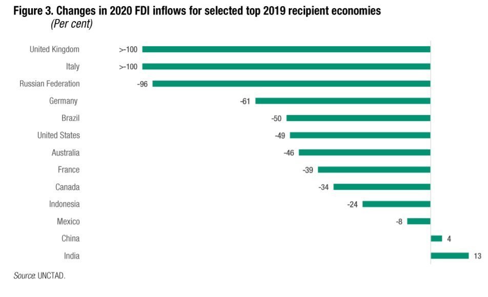 2020’de yabancı doğrudan sermaye girişlerinin yıllık değişiminde Hindistan ve Çin artış kaydeden az sayıdaki ülkeler arasında yer aldı. İngiltere ve İtalya ise sıfırlandı.