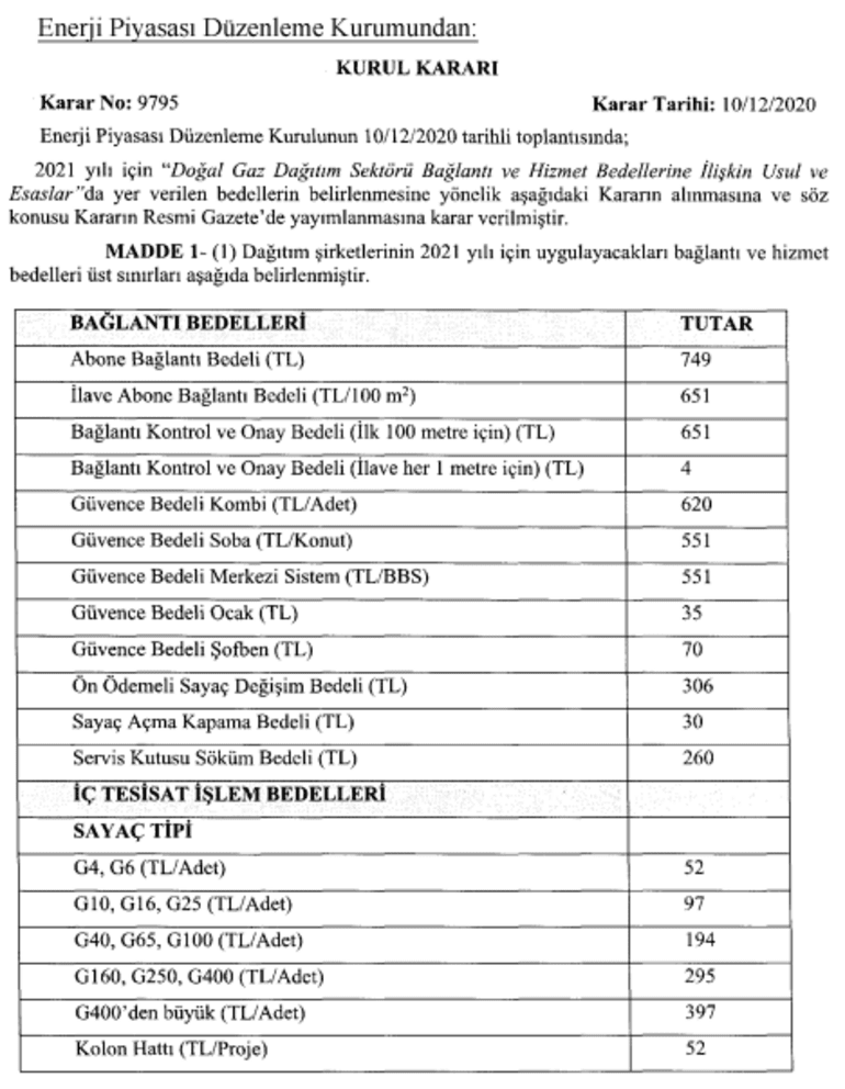 Enerji Piyasası Düzenleme Kurulu (EPDK), 2021 yılı için doğal gaz dağıtım sektörü bağlantı ve hizmet bedellerini belirledi. EPDK’nın konu ile ilgili kararı Resmi Gazete’de yayımlandı. Fiyatlar 1 Ocak 2021’den itibaren geçerli olacak.