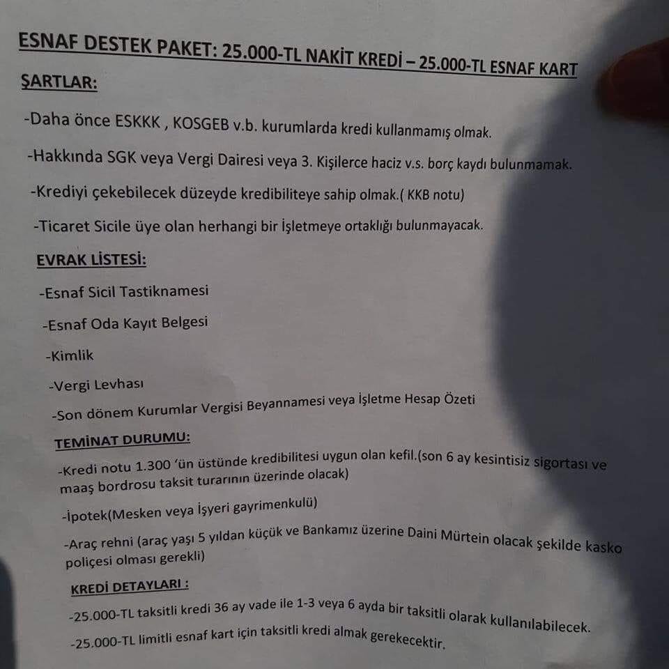 Esnaf, Halkbank’a gittiğinde ise 25 bin TL’lik krediyi kullanmak için pek çok koşulu yerine getirmeleri gerektiğini öğrendi. Bunun üzerine esnaflar sosyal medyadan tepkilerini dile getirdi.