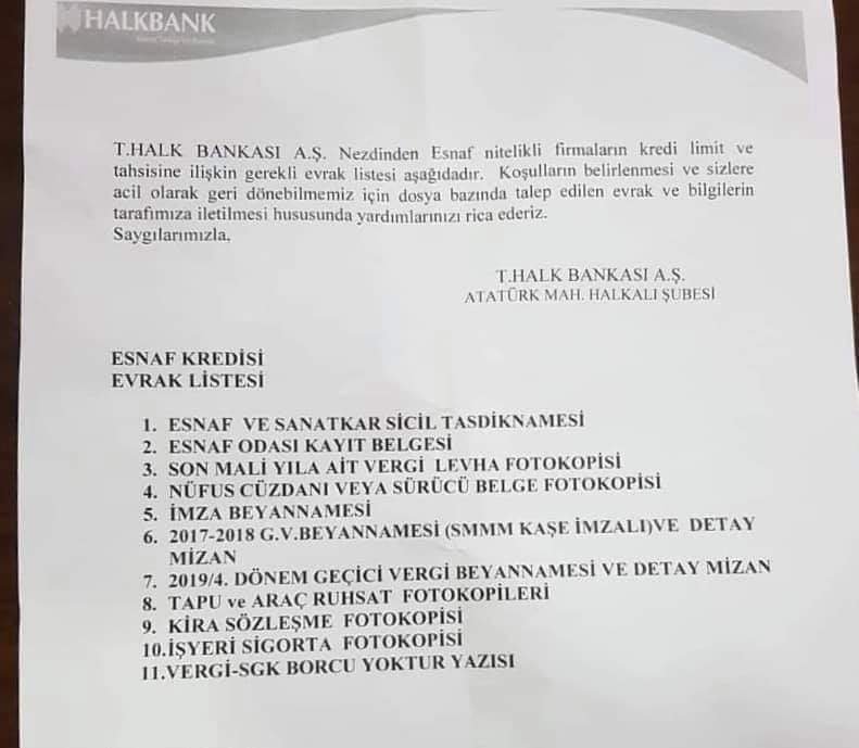 Farklı Halkbank şubelerinden esnafa verilen şart ve evrak tablolarında birbirinden farklı koşullar olduğu göze çarptı.