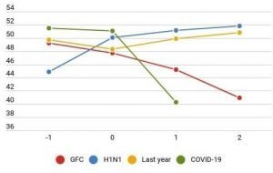 Çin’de imalat sektörü satın alma yöneticileri (PMI) endeksi. Kırmızı çizgi Eylül 2008’de başlayan finansal krizi, mavi çizgi Nisan 2009’da başlayan domuz gribi (H1N1) salgınını, sarı çizgi geçen yılın aynı dönemini ve yeşil çizgi Ocak 2020’de başlayan corona virüsü (covid_19) salgınını temsil ediyor. 0 noktası salgın ve krizin başladığı ilk ayı gösteriyor.