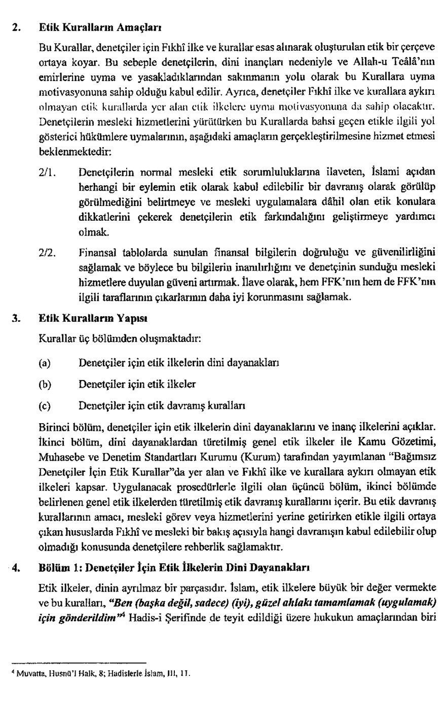 Dini dayanaklara göre belirlenen etik ilkelere göre “bir denetçi üstlerinin veya diğer insanların görünüşü nasıl olursa olsun Allah-u Teâlâ korkusuyla hareket etmelidir” denildi. Denetçiler için etik davranış kuralları 4 ayrı başlıkta belirleniyor. ‘Meşruiyet ilkesine dayalı etik davranış kuralları’ başlığı altında, “Denetçi Allah-u Teâlâ’ya karşı sorumluluğunu yerine getirmesinin diğer sorumlulukları yerine getirmesine vesile olacağına inanarak ve diğerlerine kıyasla buna öncelik vererek Allah-u Teâlâ’ya karşı sorumluluklarını mümkün olan en iyi şekilde gerçekleştirmelidir” ifadesine yer verildi.