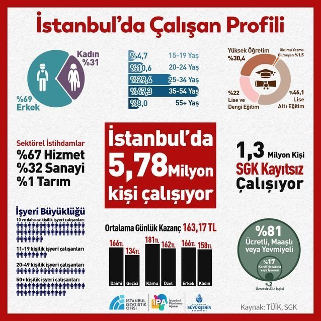 İstanbul Büyükşehir Belediyesi’ne bağlı İstanbul İstatistik Ofisi 1 Mayıs vesilesiyle TÜİK ve SGK verilerinden yararlanarak şehirdeki çalışan verilerini yayımladı. Buna göre 2020 Şubat ayı itibarıyla Türkiye’de sigortalı işçi sayısı, (4A’ya tabi zorunlu sigortalılar) 14 milyon 211 bin 588 iken, İstanbul’da 4 milyon 137 bin 618. Yani Türkiye’deki 100 işçinin 29’u İstanbul’da çalışıyor