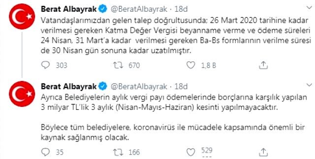 Bakan Albayrak Twitter hesabından yaptığı paylaşımda, “Vatandaşlarımızdan gelen talep doğrultusunda; 26 Mart 2020 tarihine kadar verilmesi gereken Katma Değer Vergisi beyanname verme ve ödeme süreleri 24 Nisan, 31 Mart’a kadar verilmesi gereken Ba-Bs formlarının verilme süresi de 30 Nisan gün sonuna kadar uzatılmıştır” ifadelerini kullandı.