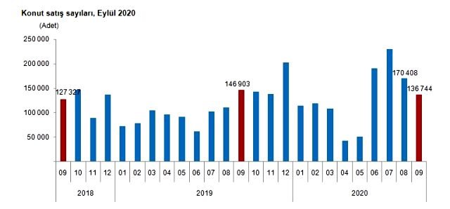 Türkiye genelinde konut satışları 2020 Eylül ayında bir önceki yılın aynı ayına göre %6,9 azalarak 136 bin 744 oldu. Konut satışlarında, İstanbul 25 bin 399 konut satışı ve %18,6 ile en yüksek paya sahip oldu. Satış sayılarına göre İstanbul’u 12 bin 677 konut satışı ve %9,3 pay ile Ankara, 8 bin 153 konut satışı ve %6,0 pay ile İzmir izledi. Konut satış sayısının düşük olduğu iller sırasıyla 17 konut ile Hakkari, 24 konut ile Ardahan ve 63 konut ile Bayburt oldu.