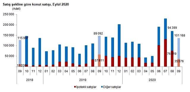 Türkiye genelinde 2020 Eylül ayında ipotekli konut satışları bir önceki yılın aynı ayına göre %38,5 azalış göstererek 35 bin 576 oldu. Toplam konut satışları içinde ipotekli satışların payı %26,0 olarak gerçekleşti. İpotekli satışlarda İstanbul 7 bin 527 konut satışı ve %21,2 pay ile ilk sırayı aldı. İpotekli konut satışının en az olduğu il 1 konut ile Hakkari oldu.