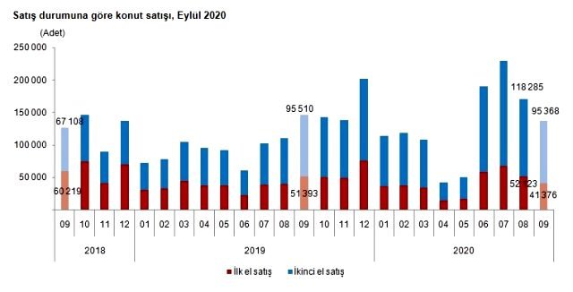 Türkiye genelinde ikinci el konut satışları 2020 Eylül ayında bir önceki yılın aynı ayına göre %0,1 azalış göstererek 95 bin 368 oldu. İkinci el konut satışlarında İstanbul 18 bin 300 konut satışı ve %19,2 pay ile ilk sıraya yerleşti. İstanbul’daki toplam konut satışları içinde ikinci el satışların payı %72,1 oldu. Ankara 9 bin 578 konut satışı ile ikinci sırada yer aldı. Ankara’yı 5 bin 887 konut satışı ile İzmir izledi.