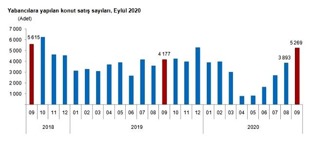 Yabancılara yapılan konut satışları bir önceki yılın aynı ayına göre %26,1 artarak 5 bin 269 oldu. Yabancılara yapılan konut satışlarında, Eylül 2020’de ilk sırayı 2 bin 370 konut satışı ile İstanbul aldı. İstanbul ilini sırasıyla bin 18 konut satışı ile Antalya, 347 konut satışı ile Ankara, 239 konut satışı ile Bursa ve 191 konut satışı ile Mersin izledi. Ocak-Eylül döneminde yabancılara yapılan konut satışları ise bir önceki yılın aynı dönemine göre %18,0 azalarak 26 bin 165 oldu.
