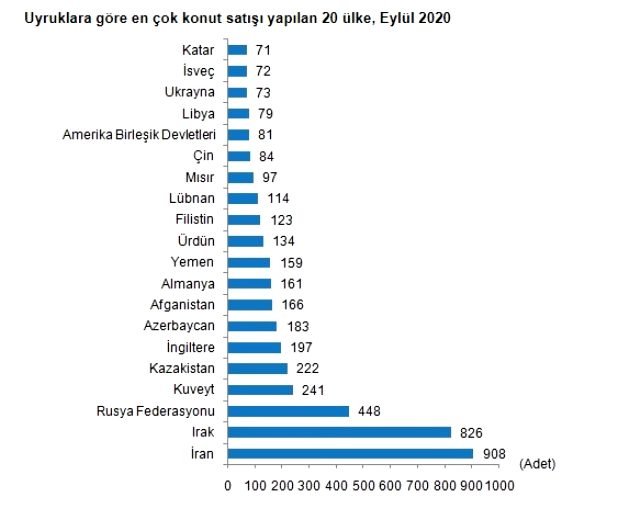 Eylül ayında İran vatandaşları Türkiye’den 908 konut satın aldı. İran’ı sırasıyla, 826 konut ile Irak, 448 konut ile Rusya Federasyonu, 241 konut ile Kuveyt ve 222 konut ile Kazakistan izledi.
