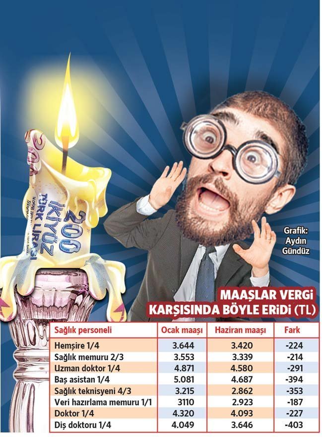 Sendikanın ocak ve haziran ayı bordroları üzerinden yaptığı çalışmaya göre örneğin üniversite mezunu bir hemşire ocak ayında 3 bin 644 lira net maaş alırken, haziran ayında bordrosundaki net maaş tutarı 3 bin 420 liraya düştü. Hemşirenin net kaybı 224 lirayı buldu.
