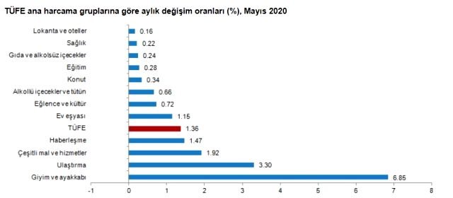 Ana harcama grupları itibarıyla 2020 yılı Mayıs ayında azalış gösteren ana grup olmadı. En az artış gösteren gruplar ise %0,16 ile lokanta ve oteller, %0,22 ile sağlık ve %0,24 ile gıda ve alkolsüz içecekler oldu. Buna karşılık, ana harcama grupları itibarıyla 2020 yılı Mayıs ayında artışın yüksek olduğu gruplar ise sırasıyla, %6,85 ile giyim ve ayakkabı, %3,30 ile ulaştırma ve %1,92 ile çeşitli mal ve hizmetler oldu.