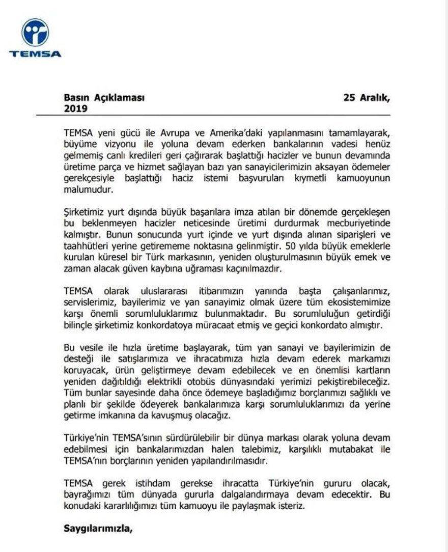 Home / Ekonomi / Son dakika… TEMSA konkordato ilanı kararı aldı!EkonomiSon dakika… TEMSA konkordato ilanı kararı aldı!25 Aralık 2019Şirket tarafından yapılan açıklama, “Şirketimiz konkordatoya müracaat etmiş ve geçici konkordato almıştır” denildi. AYRINTILAR GELİYOR… Share this ArticleEtiketlendi:haberlerTemsaPrevious ArticleSüper Lig’de 17. hafta maçlarının hakemleri belli olduNext ArticleRusya Devlet Başkanı Vladimir Putin, 5 generali görevden aldıhaberemTürkiye ve dünyadan son dakika haberleri. gündem, magazin, ekonomi, dünya, yerel ve tüm kategorilerde haberler. Related Posts TÜİK, büyüme rakamlarını bugün açıklıyor 1 Aralık 2025 Rekabet Kurumu, 40 uzman yardımcısı alacak 1 Aralık 2025 Forbody Yatırım Turu Trinkfon’da Başladı! Sağlıklı Yaşamın Gelece ... 25 Kasım 2025 Cevap bırakın Yanıtı iptal etE-posta adresiniz yayınlanmayacak. Gerekli alanlar * ile işaretlenmişlerdirYorumAd * E-posta * İnternet sitesi Daha sonraki yorumlarımda kullanılması için adım, e-posta adresim ve site adresim bu tarayıcıya kaydedilsin.