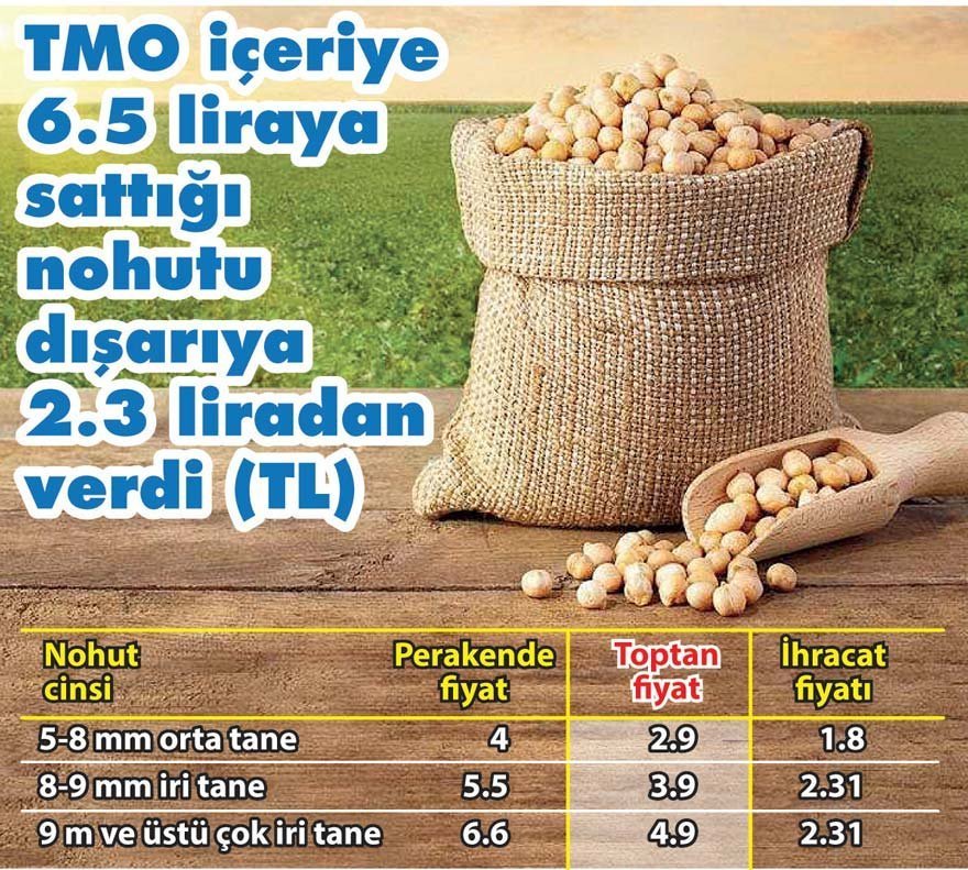 TMO internet sitesinde örneğin orta taneli nohudun ton başına toptan satış fiyatı 2 bin 900 TL olarak ilan edilmesine rağmen, ihaleyle bu nohut 314 dolardan firmaya verildi. Dolar kurunun 5.75 TL olduğu dikkate alındığında iç piyasaya toptan tonu 2 bin 900 liraya (kilosu 2.9 TL) satılan nohut ihracat yapmaları için firmalara bin 800 liraya (kilosu 1.8 TL) verilmiş oldu.
