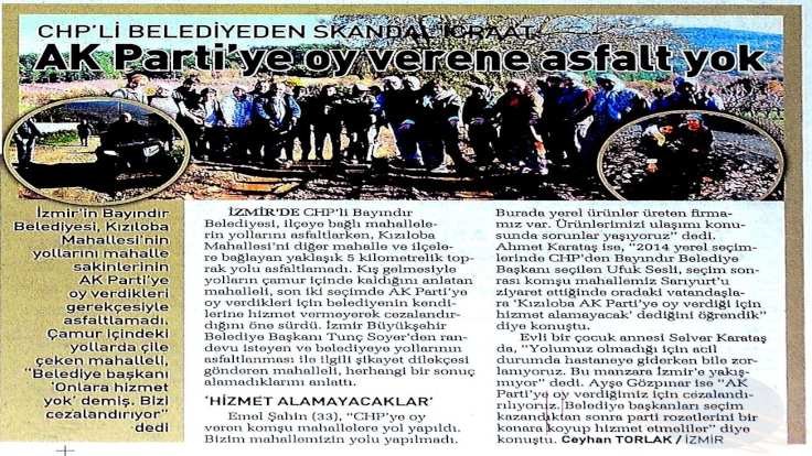 İktidara yakınlığıyla bilinen Sabah gazetesi, AKP’li İzmir Bayındır Belediyesi’nin CHP’de olduğunu zannederek, “CHP’li Belediyeden skandal icraat, AK Parti’ye oy verene asfalt ...