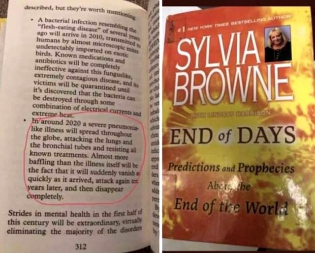 2020 yıllarında ölümcül bir salgının patlak vereceğini iddia eden bir başka yazar da Sylvia Browne oldu. Dünyanın sonu ile ilgili tahminler ve kehanetler kitabında, dünyayı tahrip eden bir pnömoni (zatürre) salgınından bahsediliyor.