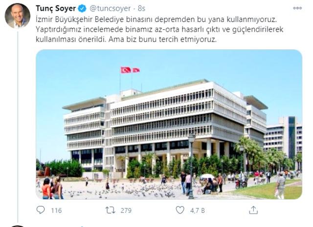 Sosyal medya hesabından yaptığı paylaşımda, depremden bu yana binayı kullanamadıklarını belirten Soyer, “Yaptırdığımız incelemede binamız az-orta hasarlı çıktı ve güçlendirilerek kullanılması önerildi. Ama biz bunu tercih etmiyoruz” dedi.