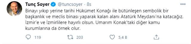 Soyer açıklamalarının devamında, “Binayı yıkıp yerine tarihi Hükümet Konağı ile bütünleşen sembolik bir başkanlık ve meclis binası yaparak kalan alanı Atatürk Meydanı’na katacağız. İzmir’e ve İzmirlilere hayırlı olsun. Umarım Konak’taki diğer kamu kurumlarına da örnek olur” ifadelerini kullandı.