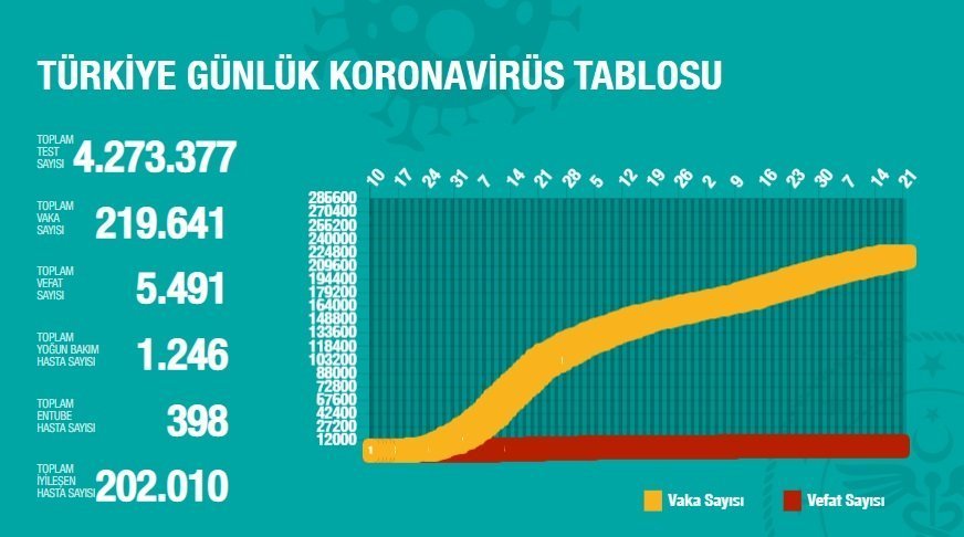 Corona nedeniyle bugün 16 kişi hayatını kaybederken, Türkiye’deki toplam vaka sayısı 219 bin 641’e, toplam vefat sayısı da 5 bin 491’e yükseldi. Paylaşılan güncel verilere göre 997 kişi daha virüsü yenerek sağlığına kavuştu. Böylece toplam iyileşen kişi sayısı da 202 bin 10’a çıktı.