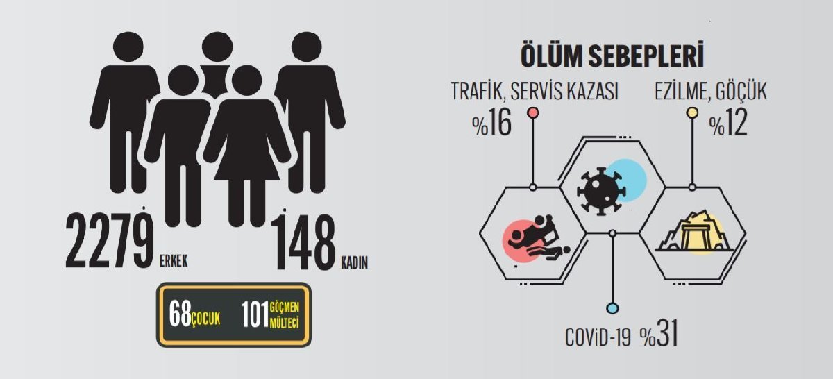 COVİD-19 nedeniyle 741 işçi, Trafik, Servis Kazası nedeniyle 388 işçi; Ezilme, Göçük nedeniyle 296 işçi; Yüksekten Düşme nedeniyle 237 işçi; Kalp Krizi, Beyin Kanaması nedeniyle 190 işçi; Şiddet nedeniyle 105 işçi; Elektrik Çarpması nedeniyle 104 işçi; Zehirlenme, Boğulma nedeniyle 87 işçi; İntihar nedeniyle 73 işçi; Patlama, Yanma nedeniyle 53 işçi; Nesne Çarpması, Düşmesi nedeniyle 27 işçi; Kesilme, Kopma nedeniyle 21 işçi; Diğer nedenlerden dolayı 105 işçi hayatını kaybetti.