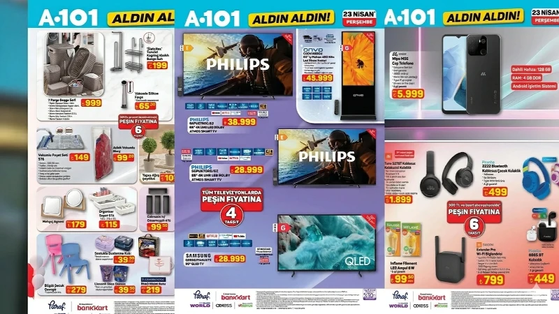 Alışveriş tutkunlarının yakından takip ettiği aktüel katalog yayımlandı. A101 23 Nisan haftasına özel hazırladığı kampanyada televizyon, akıllı telefon ve beyaz eşya gibi birçok ürünü avantajlı fiyatlarla satışa sunuyor. Çocuklara özel bisiklet ve oyuncak seçenekleri de katalogda öne çıkıyor.
