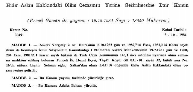 Dosyayı inceleyen 10 kişilik Adalet Komisyonu; yedi kabul, iki ret, bir çekimser oyla “Hıdır Aslan hakkındaki ölüm cezasının yerine getirilmesine dair ekli kanun tasarısının Genel Kurul’a sunulmasına” karar verdiğinde takvim yaprakları 21 Haziran 1984 gününü gösteriyordu.
