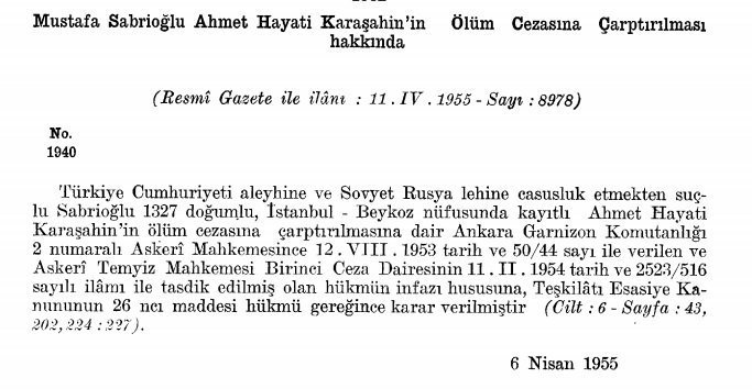Hayati Karaşahin’in yargılanması ve temyiz süreci iki yıl sürdü. “Türkiye Cumhuriyeti aleyhine ve Sovyet Rusya lehine casusluk etmekten” suçlu bulundu, idama mahkûm edildi, dosya TBMM’ye gönderildi.