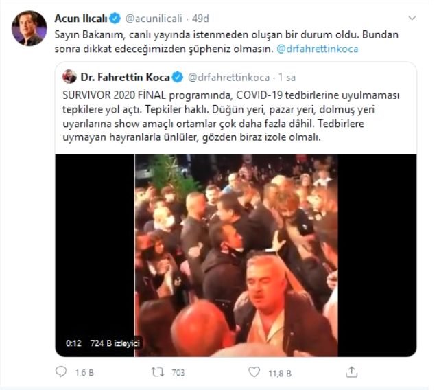 Sağlık Bakanı Fahrettin Koca’nın eleştirisi üzerine ise TV8 ve Acun Medya’nın patronu Acun Ilıcalı sosyal medya hesabından açıklama yaptı. Bakan Koca’nın tweetine yanıt veren Acun Ilıcalı, “Sayın Bakanım, canlı yayında istenmeden oluşan bir durum oldu. Bundan sonra dikkat edeceğimizden şüpheniz olmasın” dedi.